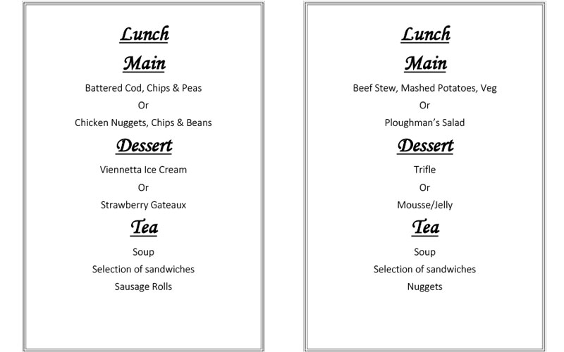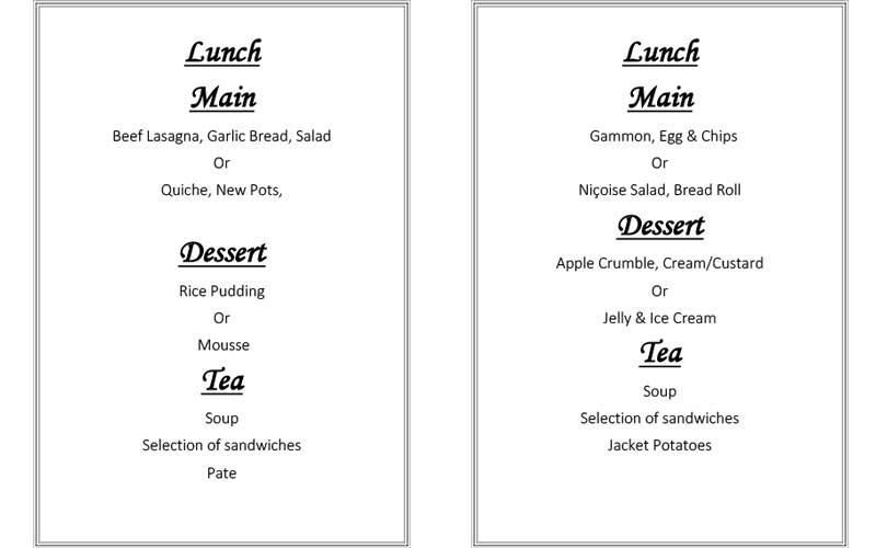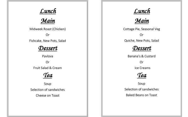 We can cater for all dietary requirements - special diets, low fat, diabetic, low sodium, gluten free, vegetarian and if aware of a diagnosis all illnesses requiring specialist diets. Sample menus shown here.